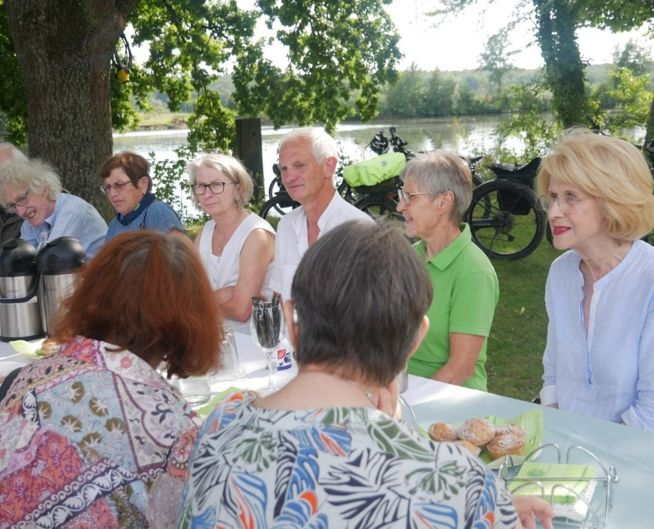 Im August gab es für alle an der Reihe 55+ Interessierten einmal etwas anderes: Wir haben einen Ausflug zur „Main Lounge“ in Untertheres gemacht. Empfangen wurden wir dort wie Staatsgäste: weiß gedeckte, mit frischen Blumen geschmückte Tische erwarteten uns. Wir saßen im Schatten alter Bäume unmittelbar am Ufer des Mains, am einstigen Landeplatz der Fähre. Von der hochsommerlichen Hitze des Tages spürten wir wenig. Wir konnten es uns bei Getränken aller Art – von unserem Gastgeber gestiftet, der diesen schönen Rastplatz am Radweg zwischen Schonungen und Haßfurt eingerichtet hat - einfach gut gehen lassen und seinen Worten lauschen. Klar, von seinen Gästen war vorzugsweise die Rede, von denen die aufgelegten Gästebücher beredt Zeugnis ablegen: Einträge auf gut Fränkisch natürlich, aber auch auf Englisch (USA, Australien, Dänemark), auf Französisch (Frankreich, Luxemburg), auf Spanisch (Südamerika) und Arabisch (Syrien)… Und alle waren mit dem Radl da!!! Es gibt da wohl Fahrradbegeisterte, die sich via Internet Touren durch ganz Europa zusammenstellen, dann mit Flugzeug und Bahn anreisen und z.B. mit dem Rad von den Quellen des Mains bis an seine Mündung radeln. Für mich wär das eher nichts, ich würde da lieber in ein Boot steigen. Warum nicht – auch mit dem Kanu kann man so eine Tour machen und dann beim „Schorsch“ alias Georg Göb in der Main Lounge an Land gehen und eine erfrischende Pause machen. Wir bedanken uns bei ihm und seiner Frau für die tolle Bewirtung sowie unseren Schonunger Küchenfeen für leckeres Backwerk, das sie mitgebracht hatten. wk